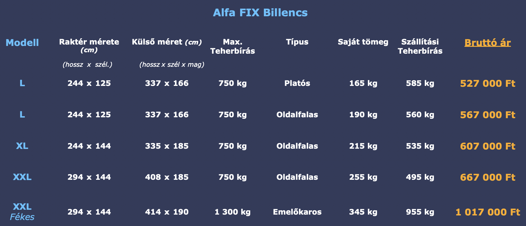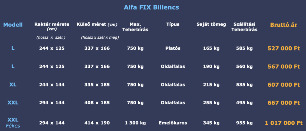 Az összes Alfa FIX utánfutóhoz való kiegészítő (ponyva, oldalfal magasító stb.) használható hozzá.