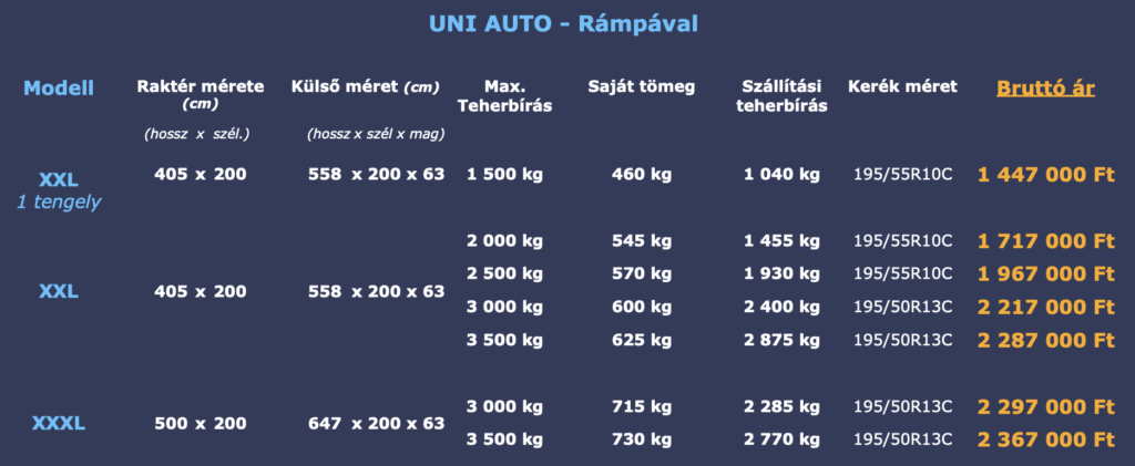 Amennyiben a rámpa és tartója nem létszükséglet, akkor az UNI PLATÓ utánfutók között még rengeteg különböző méretű és terhelhetőségű futó közül lehet választani.